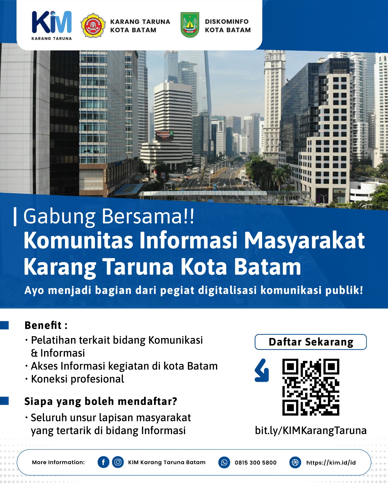 Arahbatam.com, BATAM – Karang Taruna Kota Batam membuka kesempatan bagi putra dan putri Batam yang memiliki kepedulian sosial serta semangat mengembangkan diri, khususnya di bidang informasi, untuk bergabung dalam Komunitas Informasi Masyarakat (KIM) Karang Taruna Batam.