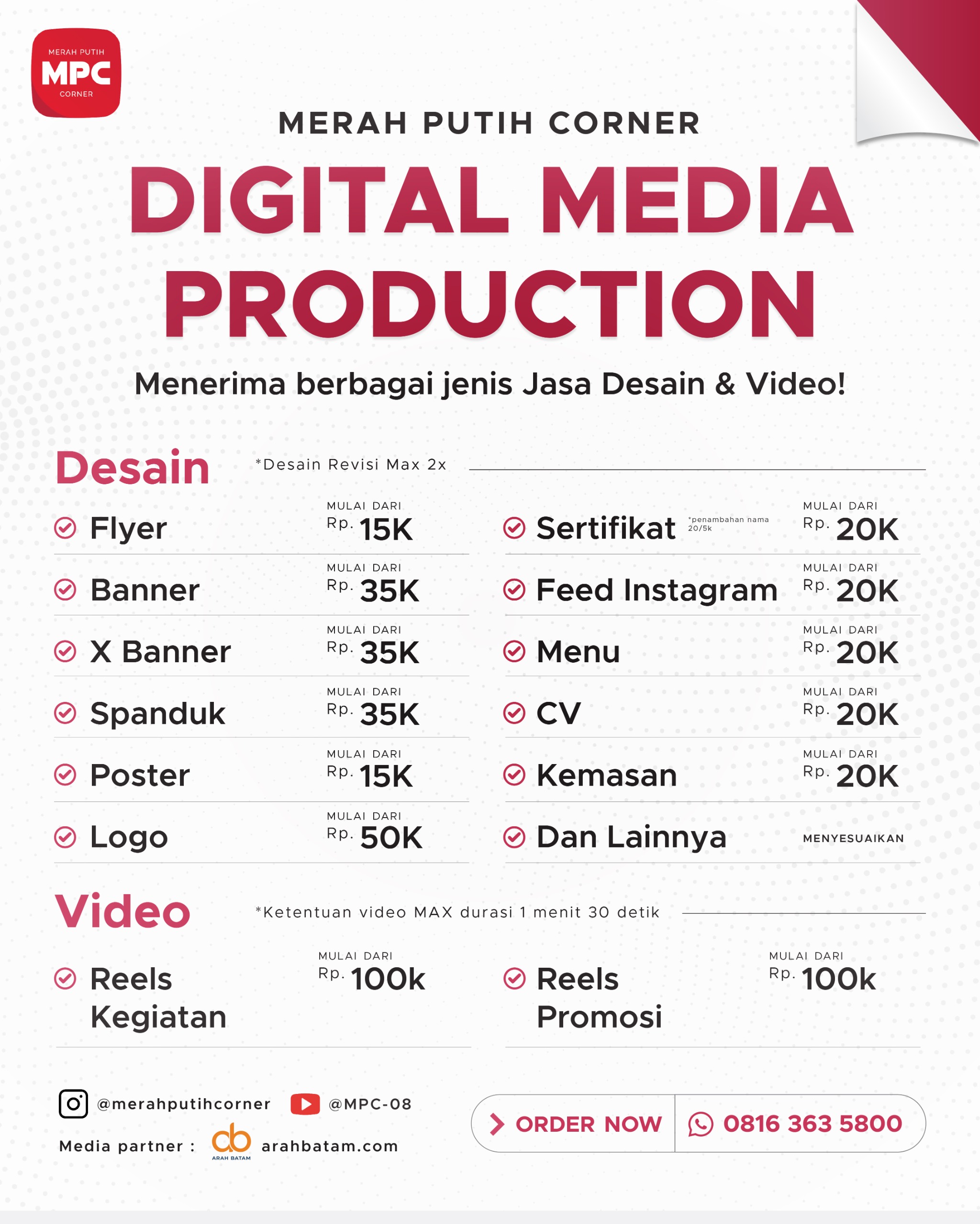 Arahbatam.com — Di era digital seperti sekarang, kebutuhan akan desain visual dan konten video semakin meningkat pesat. Baik untuk kebutuhan bisnis, promosi, maupun personal branding, kehadiran media digital yang menarik menjadi faktor penting dalam menarik perhatian audiens. Melihat peluang tersebut, Merah Putih Corner (MPC) kini resmi menghadirkan layanan Digital Media Production yang mencakup berbagai jenis jasa desain dan video di Batam.